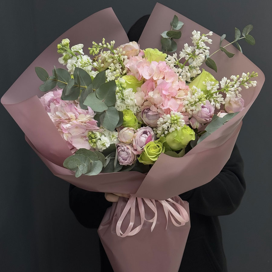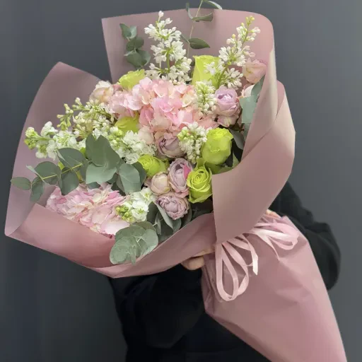 У складі букета – пишні гортензії, що символізують подяку та щирість, кущові півоноподібні троянди з ніжною текстурою пелюсток, ароматна матіола, яка додає відчуття свіжості, та стильний евкаліпт, що створює об’єм і підкреслює природну красу квітів. Також у букеті присутні еквадорські троянди та екзотичні елементи, що роблять композицію по-справжньому унікальною.