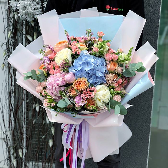 До складу букета входять ніжні антиринум, повітряна астільба, вишукана вероніка та гортензія у відтінках весняного блакитного, які символізують гармонію та спокій. А яскраві піоноподібні троянди додають нотку романтики та витонченості. Усі ці квіти гармонійно доповнюють декоративна зелень, створюючи чарівний і збалансований образ.