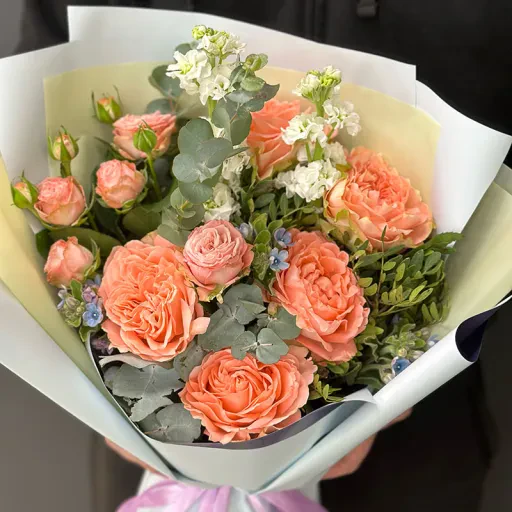 Букет в асортименті з піоноподібною трояндою «Allison» — це справжній вибух кольорів та ніжності. До складу композиції входять ексклюзивні кущові піоноподібні троянди, еустоми, матіоли, оксипеталум, евкаліпт і еквадорські троянди. Кожна квітка у букеті підібрана з любов’ю, що робить його універсальним вибором для будь-якого випадку.