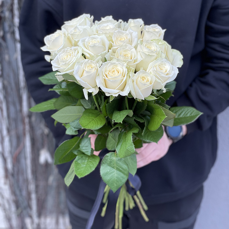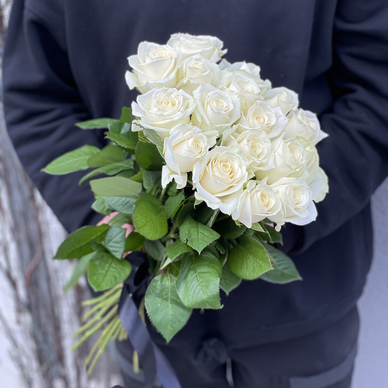 16 white roses in black ribbon