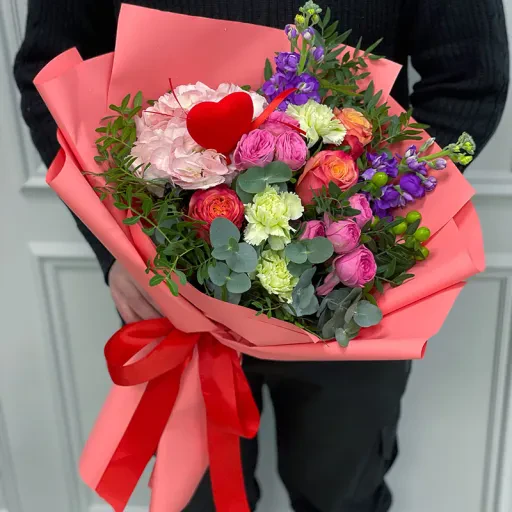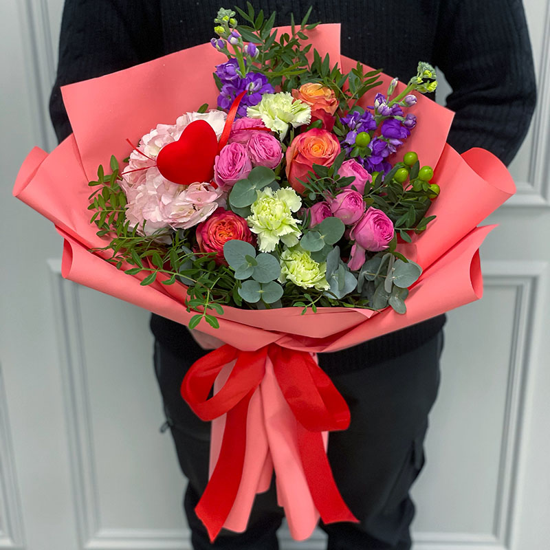 What makes it special is its versatility: pastel roses add a touch of tenderness, while bright elements bring joyful notes. The hydrangeas symbolize sincerity and luxury, making this bouquet an extraordinary choice. Our florists pay attention to every detail to ensure you receive only the freshest, most exquisite flowers.