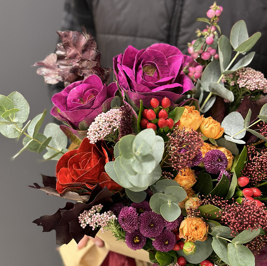 Brassica, roses, osotanus, skimmia, hypericum, and exotic flowers combine to create a unique play of colors and textures.Bouquet highlights: