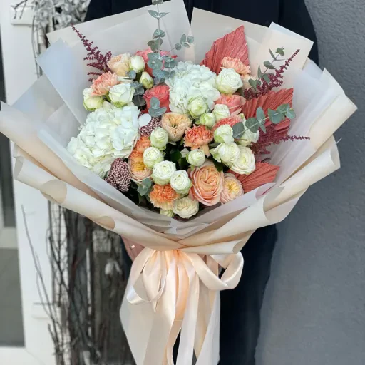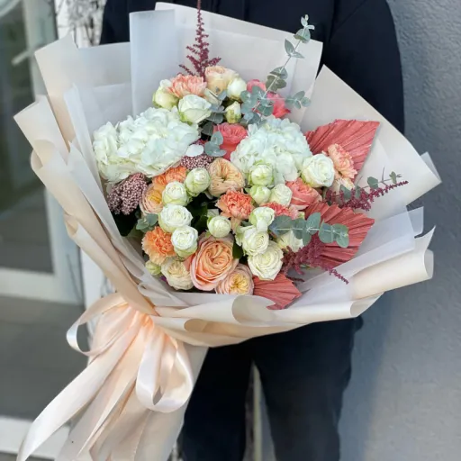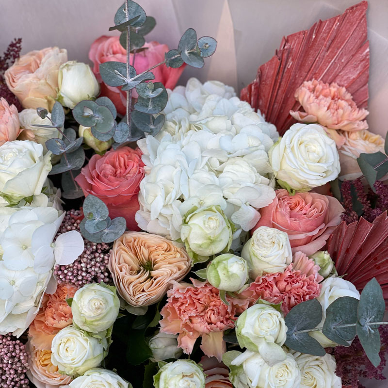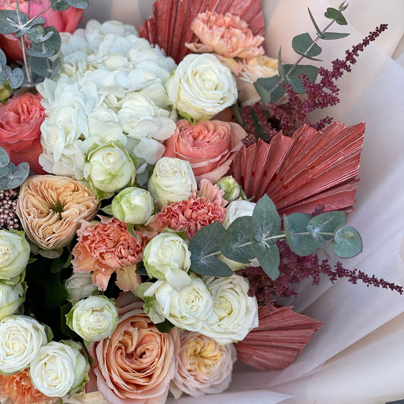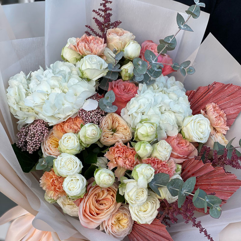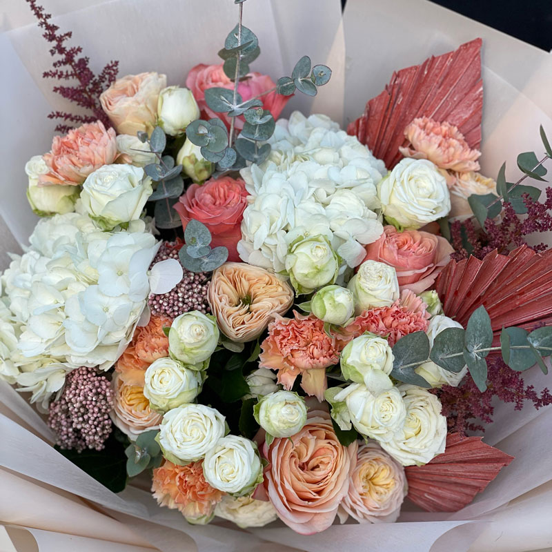 The author's bouquet of flowers «Softness» is like a dream come true. Just like that, it was blown by the warmest and softest breeze in the world. The palette of the bouquet is incredibly saturated, but each next shade only emphasizes the previous one: white, lilac, pink, green or Orange. Hydrangea is perceived as the most tender here. It is absolutely certain that the white color is to blame. But look how quivering is the tenderness of delicate carnations and magnificent roses. Without them, the composition would be incomplete. But Astilbe (arbiter of fate) and exotic (finishing touch).