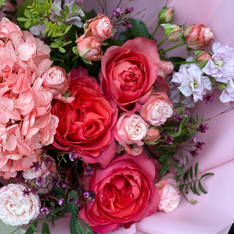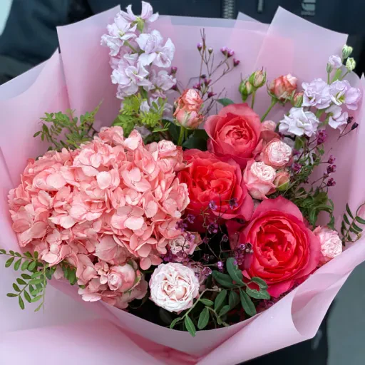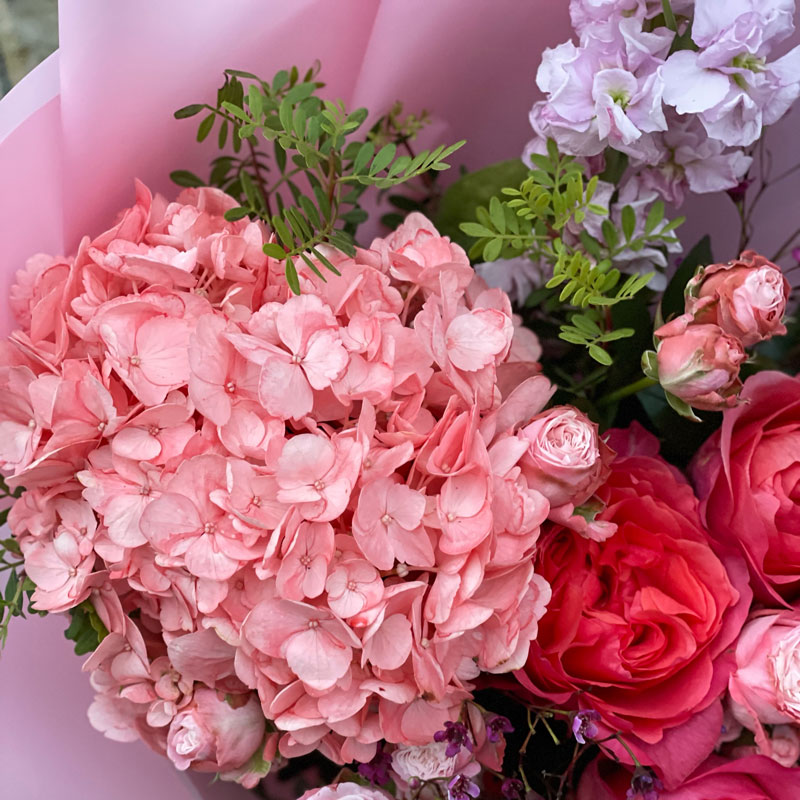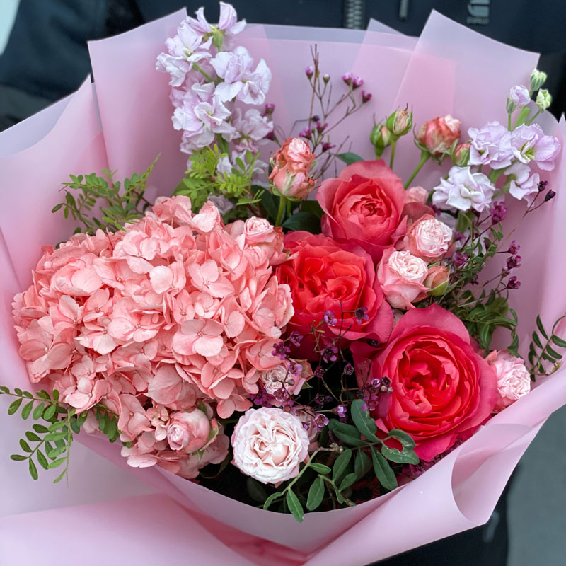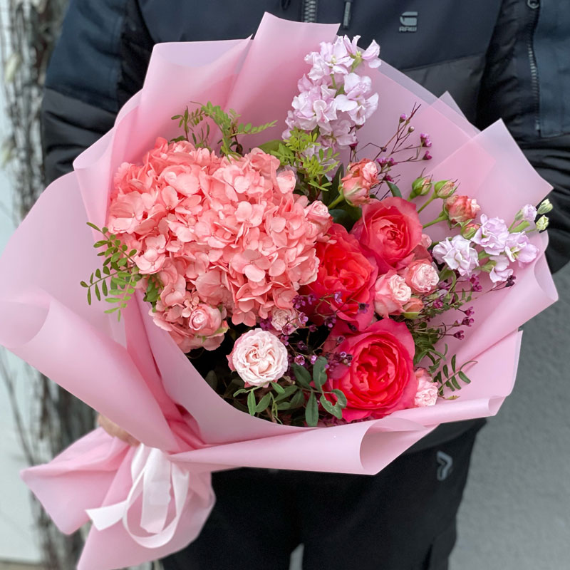 Author's bouquet of flowers «Stacy» is a refined composition that captivates with its elegance and harmony. Its centerpiece is a hydrangea, symbolizing gratitude and sincerity. Luxurious spray roses and Madame Bombastic peony-like roses add a touch of tenderness, while bright accents of chamelaucium create a unique mood. The bouquet is completed with stock flowers and greenery for a perfectly balanced design.