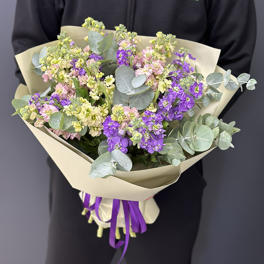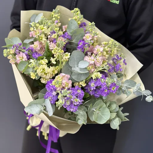 The 25 Multicolored Matthiola Bouquet by BuketLand is a vibrant splash of color and fragrance that brightens any space. Each matthiola is carefully selected to ensure freshness and harmony, with yellow, purple, and soft pink blooms perfectly complemented by lush greenery.