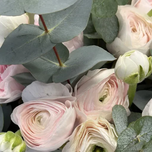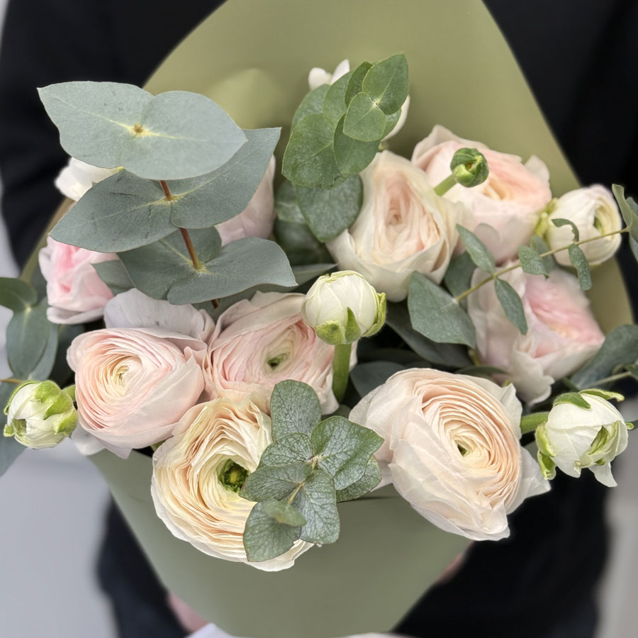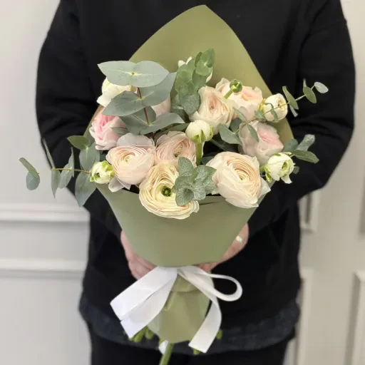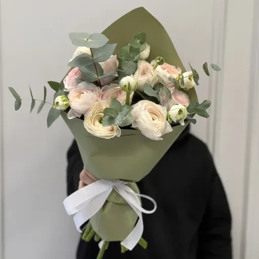 The bouquet is stylish and attractive. Flowers will please their freshness and they will perfectly refresh the interior, decorate it and give a zest. Such a gift is an excellent choice for any holiday. Ranuncles cause love in girls and women. Delivery of flowers in Kiev - the opportunity to make an expensive gift to the heart of a person. (ranunculus, ranunculus)