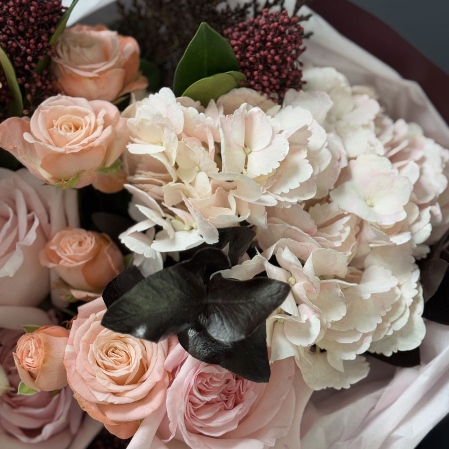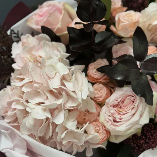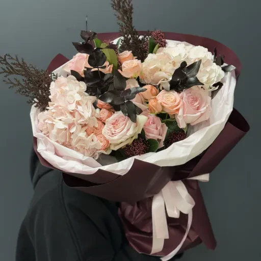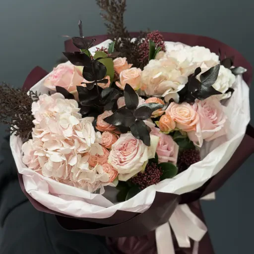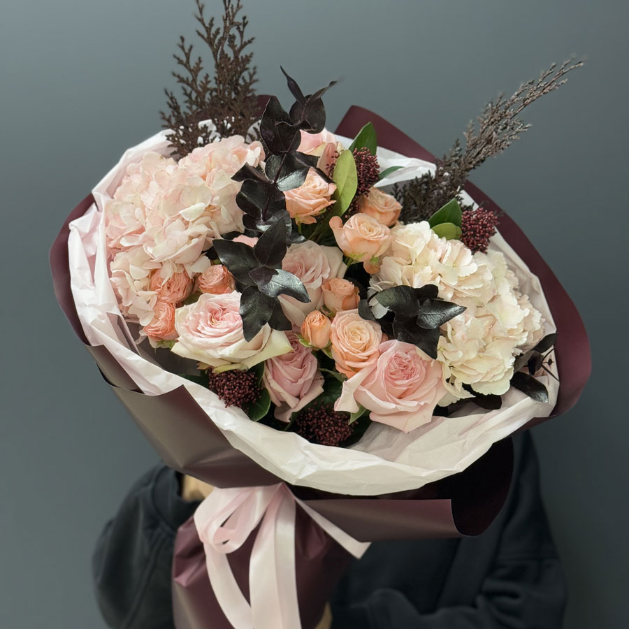 Bouquet of flowers «Evening Elegance» is the epitome of sophistication, tenderness, and harmony. Its composition combines noble hydrangeas, creamy peony-shaped roses, lush eucalyptus greenery, and accents of coniferous branches and skimmia for added texture and refinement. Charming pink roses of the «Pink Ohara» variety bring lightness and romance, while bombastic roses add a playful touch and volume.