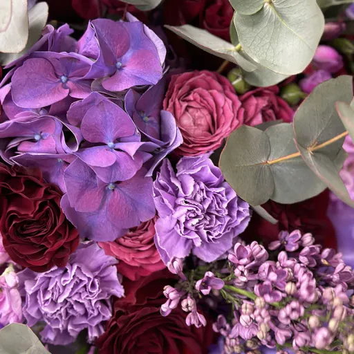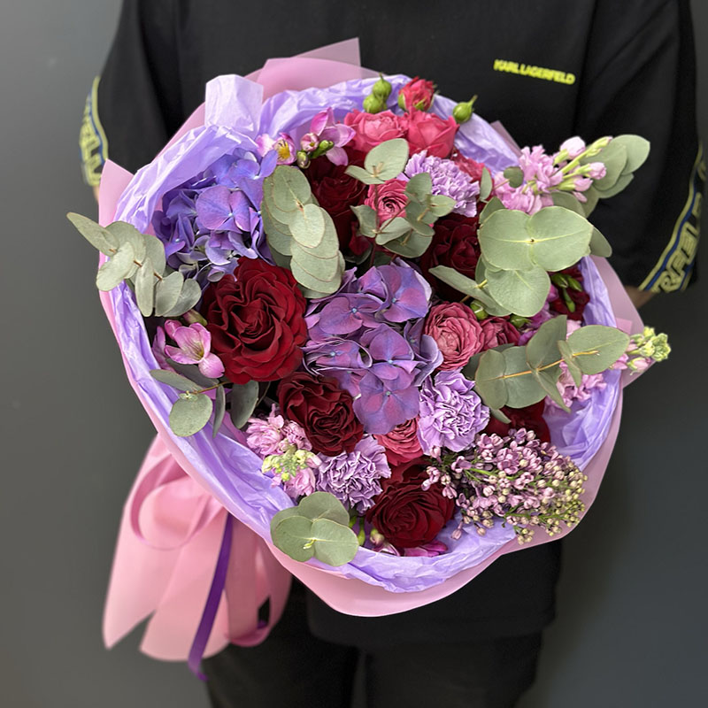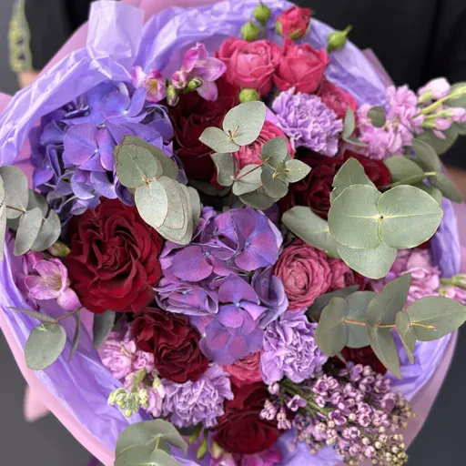 The «Fabulous» bouquet is a perfect choice for those who want to add elegance and charm to any occasion. This bouquet features deep red roses, delicate lilac hydrangeas, powdery spray roses, and fresh eucalyptus branches. The vibrant and pastel shades create a stunning and sophisticated arrangement.