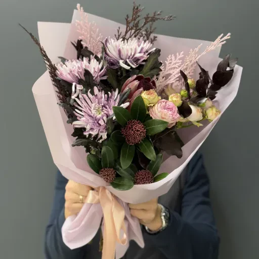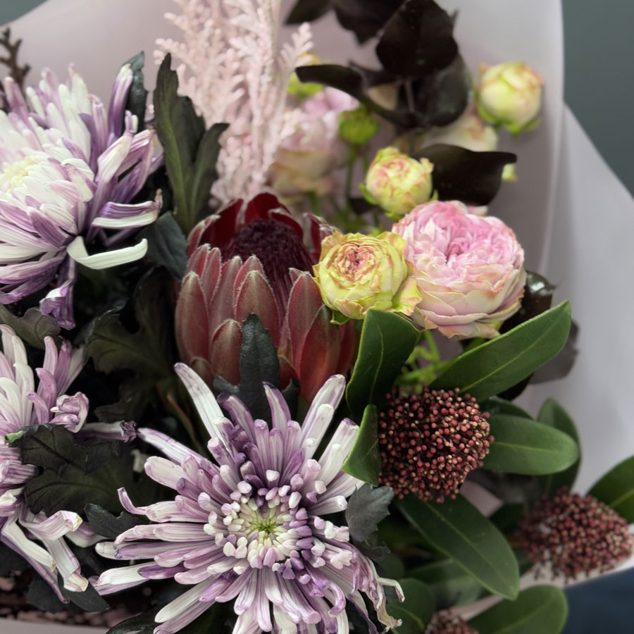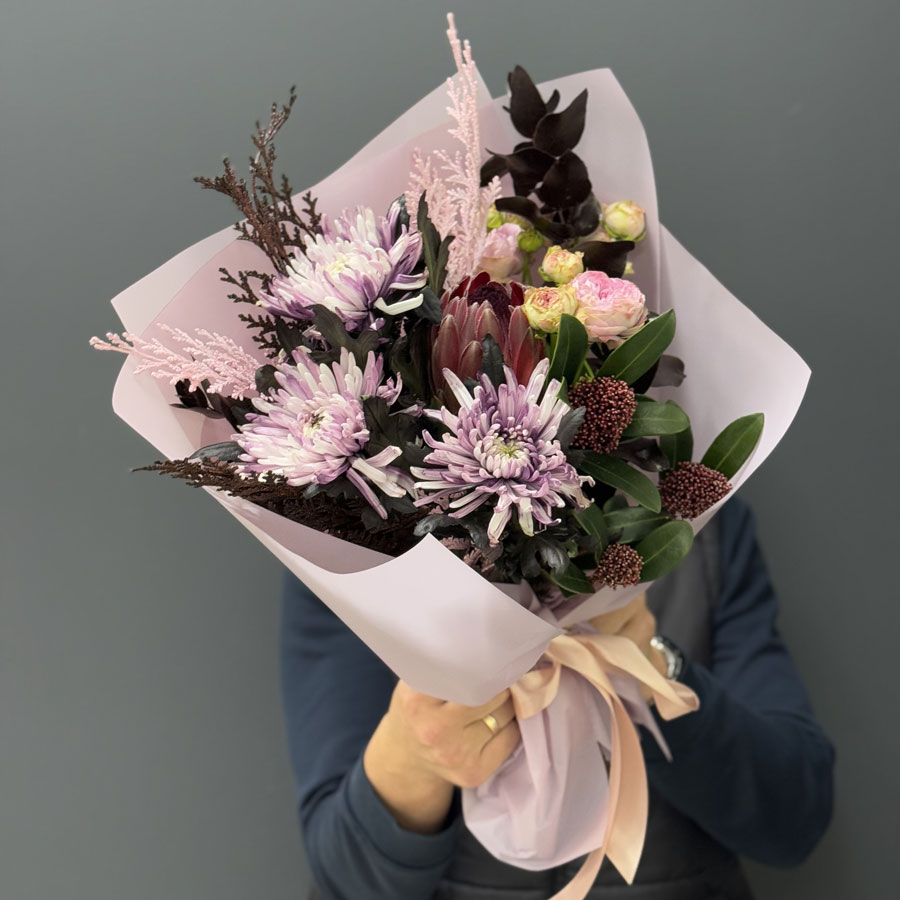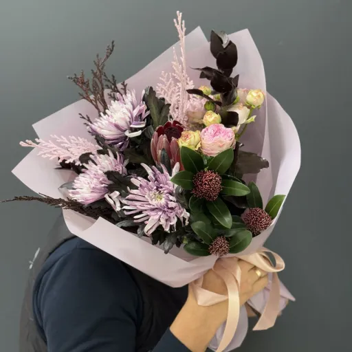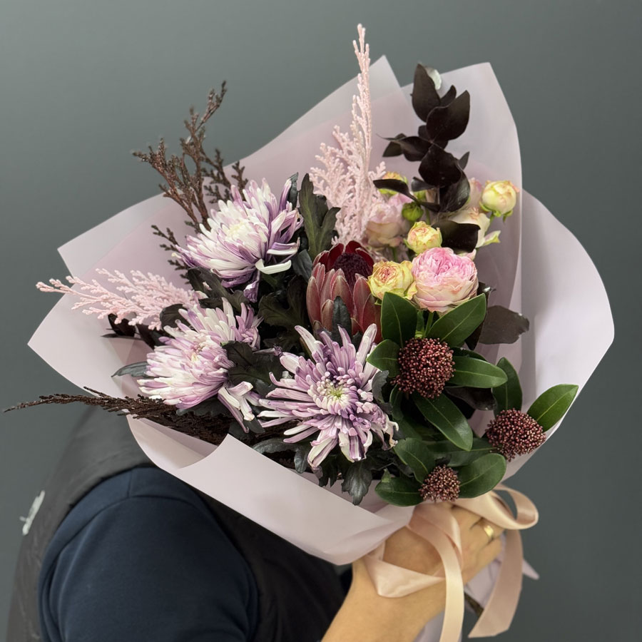 Bouquet of flowers «Moonlight» is a delicate composition that enchants with its mysterious charm. It features four elegant sprigs of conifer, tender peony-shaped roses "Blossom" (2 pcs), exotic protea, sophisticated skimmia, charming chrysanthemum, and fresh eucalyptus. This combination of pastel and rich tones makes it a perfect choice for birthdays, anniversaries, or just to create a pleasant surprise.