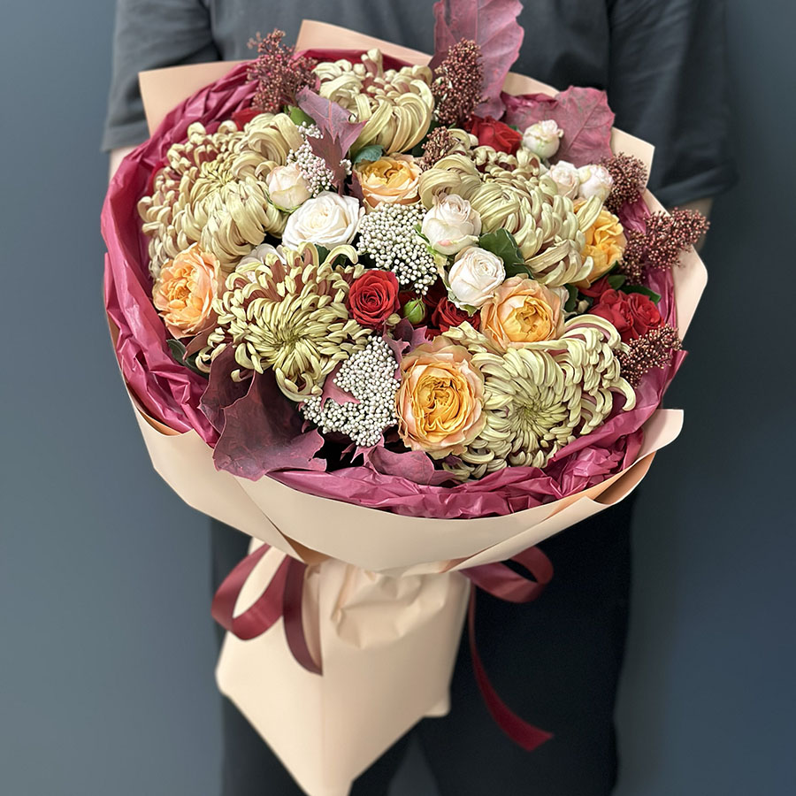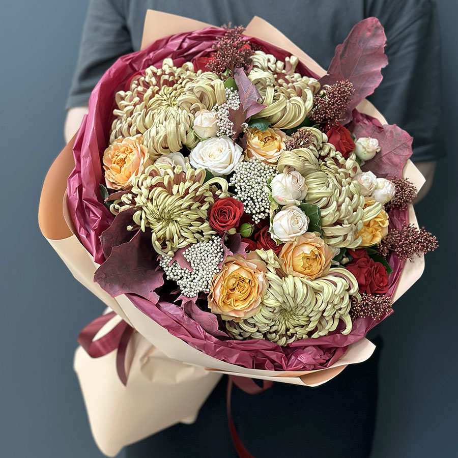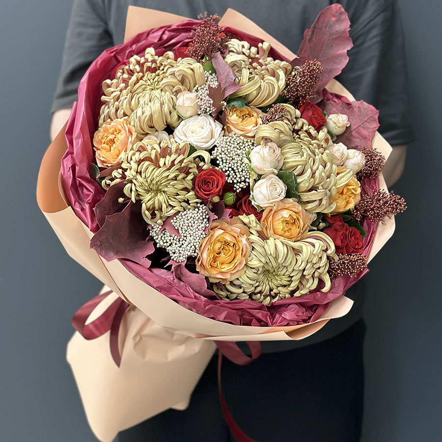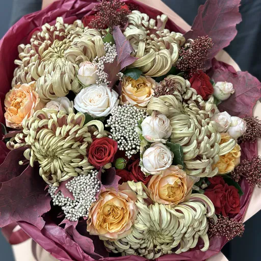 Autumn bouquet of flowers «Warm Hugs» is the epitome of coziness and beauty. Carefully crafted to impress anyone receiving it, this bouquet features tender Velvet Blossoms spray roses and peony-shaped Bombastic roses as its focal point, adding romance and charm. Unique peony-shaped roses and assorted chrysanthemums enhance the composition with volume and texture. Skimmia and exotic accents bring vibrant touches, creating an unforgettable palette of autumn shades.