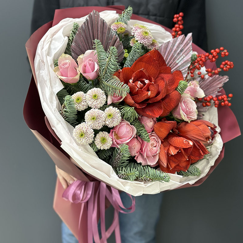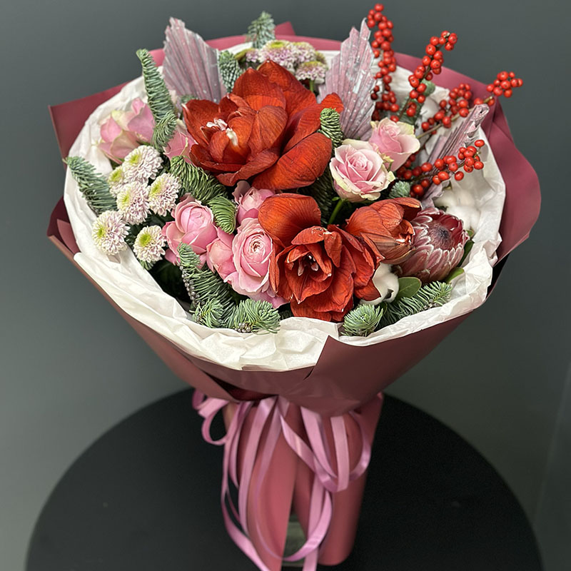 Winter designer bouquet in red tones from BuketLand is a sophisticated mix of deep red and soft pink tones, perfectly embodying the spirit of winter festivities. This bouquet includes an exotic amaryllis, luxurious peony-shaped roses, elegant Kimberly roses, chrysanthemums, noble nobilis, decorative greenery, and bright ilex berries. Each element has been carefully selected to create an atmosphere of warmth, elegance, and coziness.