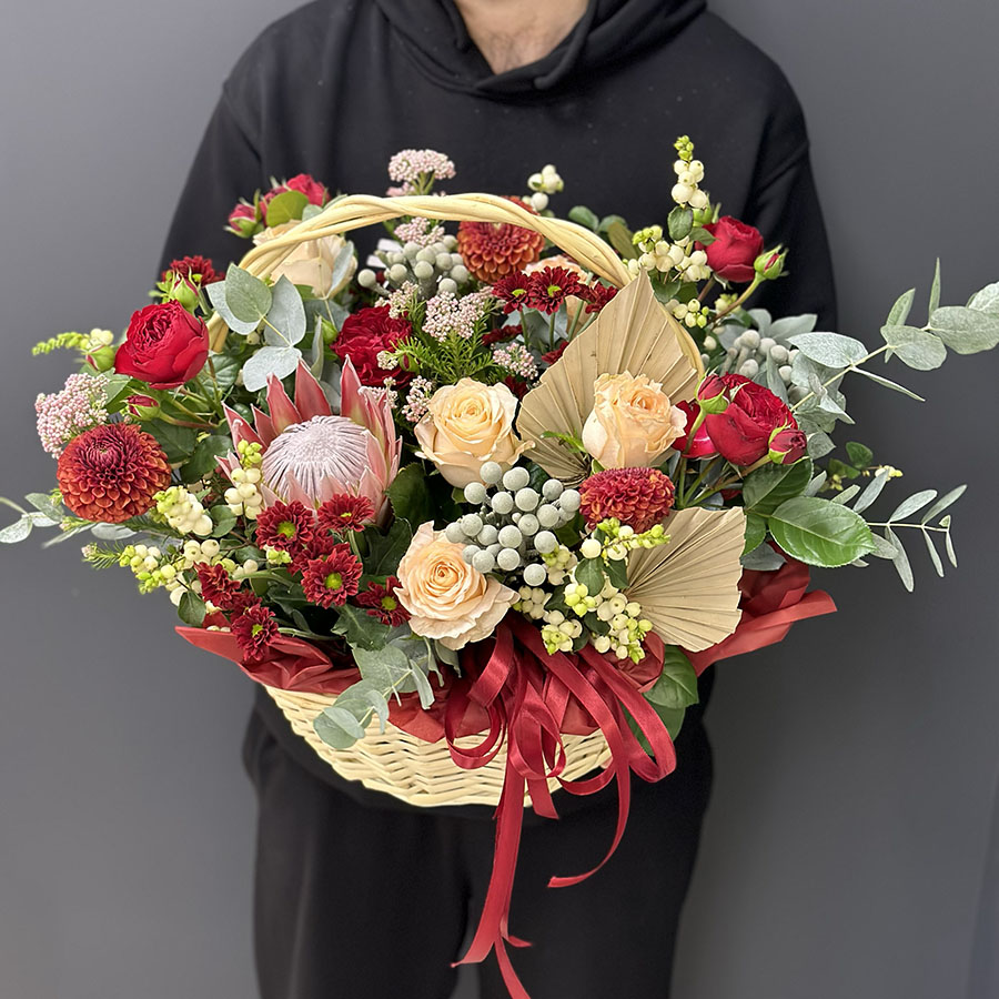 Букет складається із кущових троянд Velvet Blossoms, одноголових хризантем, піоноподібних троянд, а також протеї та озотамнусу, що додають композиції загадковості. Листя евкаліпта і сухоцвіти гармонійно доповнюють стильний вигляд букета. Завдяки червоним і золотистим відтінкам квітів, цей букет викликає відчуття тепла та розкоші.