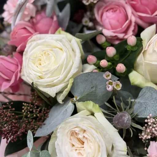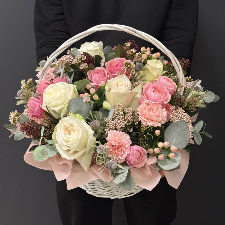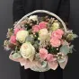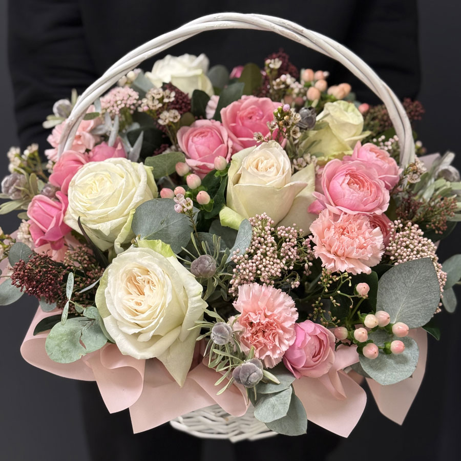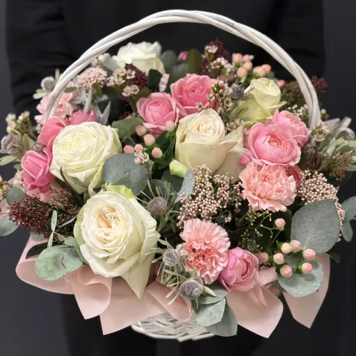 Композиція у кошику «Sweetness» — це витвір флористичного мистецтва, який поєднує ніжність, витонченість і стиль. Основу букета складають рожеві та кремові троянди, які символізують любов, подяку та гармонію. Їх доповнюють м'які відтінки гвоздик, евкаліпт, ягідки та декоративна зелень, що створюють відчуття природної легкості й витонченості.