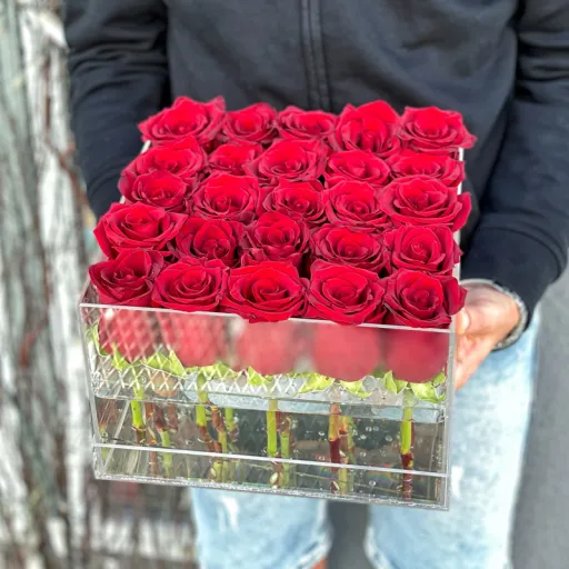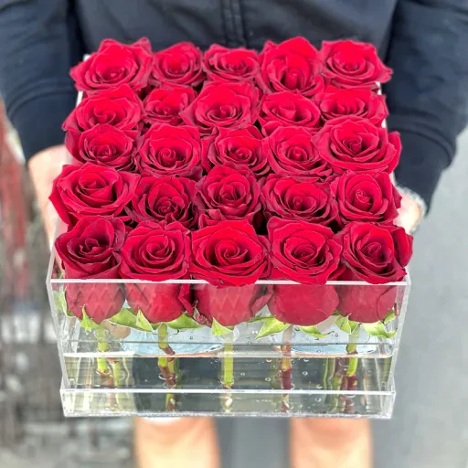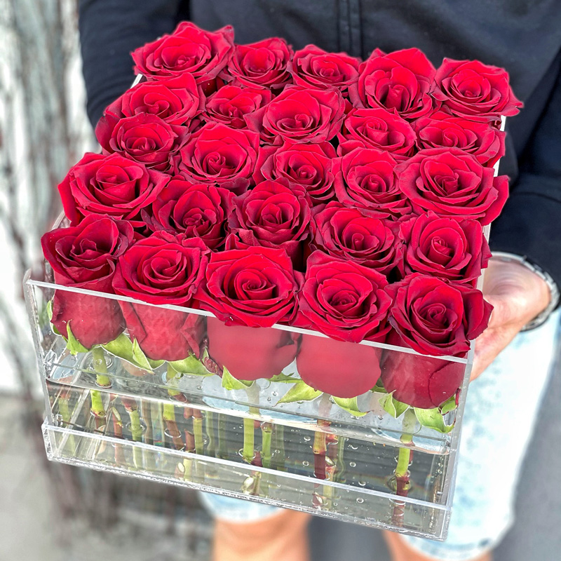 Композиція в прозорій коробці з 25 червоних троянд