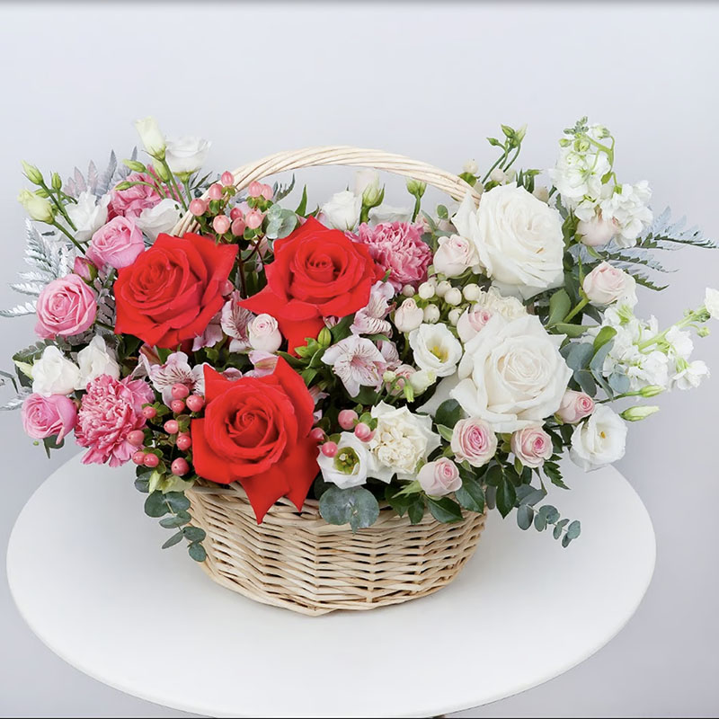 Кошик з квітами у яскравих тонах — це витончене поєднання природної краси та гармонії, створене, щоб підкреслити ваші почуття та зробити важливі моменти ще особливішими. Композиція включає розкішні червоні троянди, ніжні рожеві кущові троянди, витончені білі еустоми та матіоли, що символізують вишуканість, щирість та гармонію. Хвойні гілочки додають свіжості та природності, а акуратний плетений кошик робить цей букет ідеальним для подарунка.