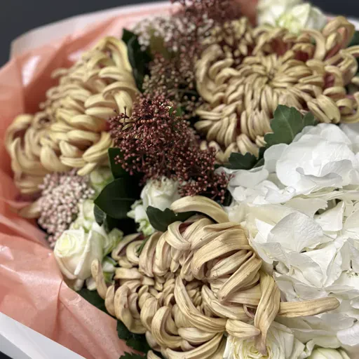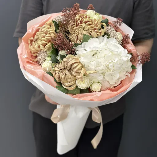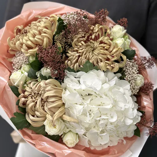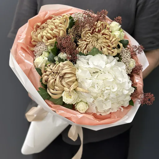Осінній букет квітів «Golden Leaves» – витончена композиція, яка об'єднує тепло та гармонію золотої пори. У складі букета: гортензія, яка символізує щирість і подяку; кущові півонієподібні троянди сорту Міс Бомбастік, що створюють атмосферу ніжності; хризантеми – квіти, які асоціюються із довголіттям та щастям; а також озотамнус і скіммія, що додають витончених текстур.
