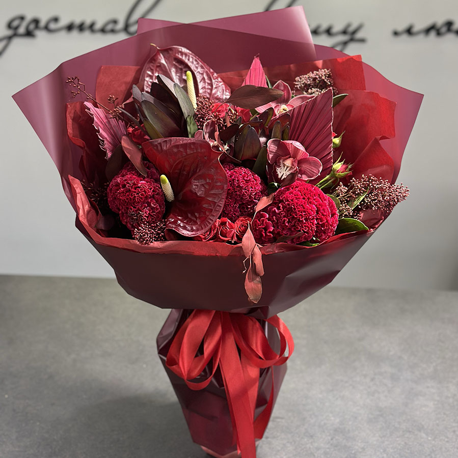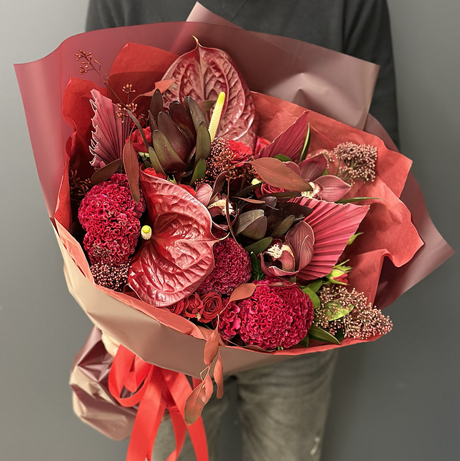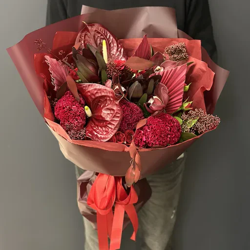 Осінній букет квітів у червоних тонах — це справжній вибух пристрасті та емоцій, втілений у найвишуканіших відтінках червоного. Букет складається з антуріуму, цимбідіуму, троянд, целюзії та декоративної зелені, які гармонійно поєднані, створюючи елегантну композицію. Антуріум символізує сильні почуття, орхідея цимбідіум додає нотки витонченості, а червоні троянди завжди залишаються незмінним атрибутом пристрасті та кохання.