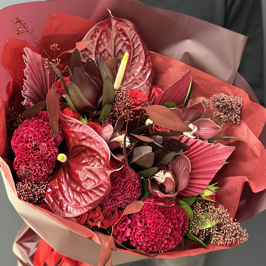 Цей букет ідеально підійде для особливих випадків: ювілеїв, річниць чи важливих побачень. Його насичена палітра червоного привертає увагу, робить атмосферу теплішою і виражає щирі емоції. Він стане розкішним подарунком для людини, яка заслуговує на найкраще.