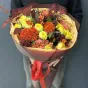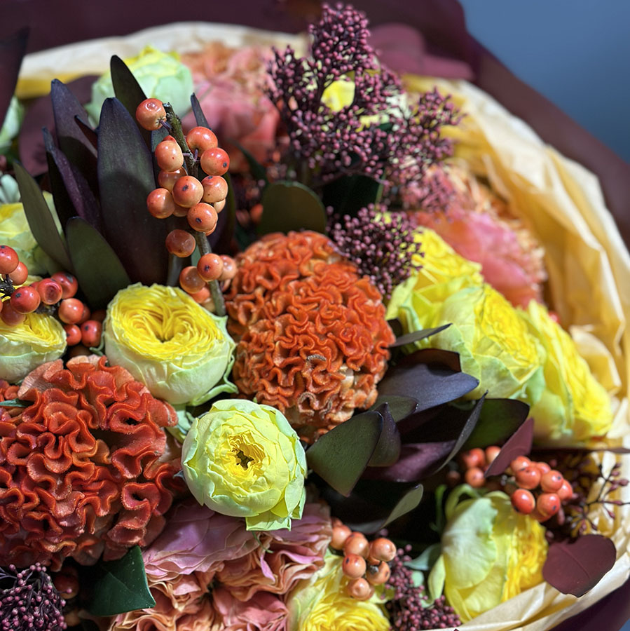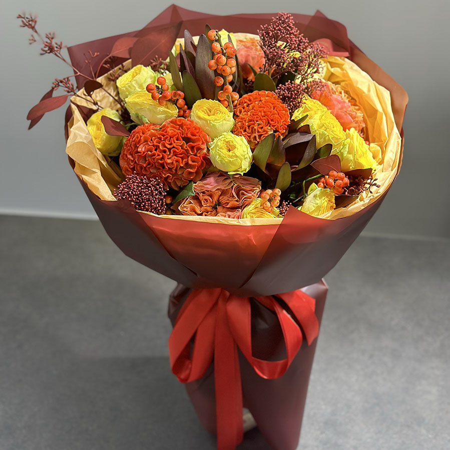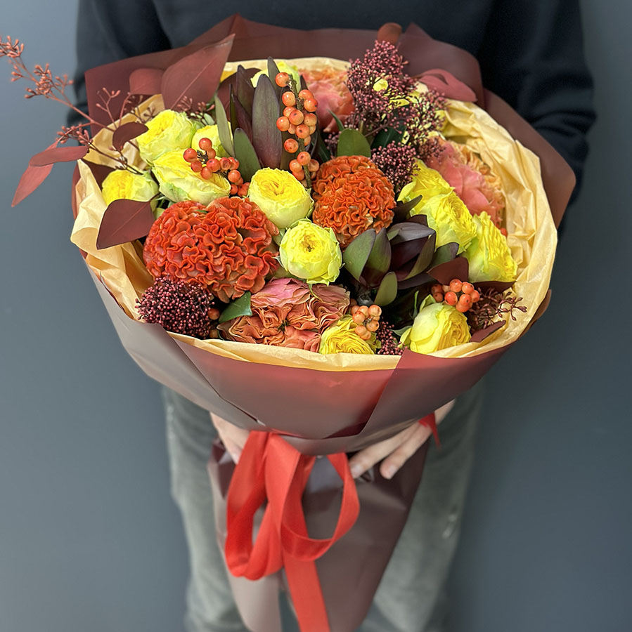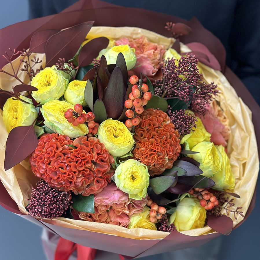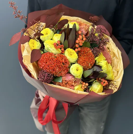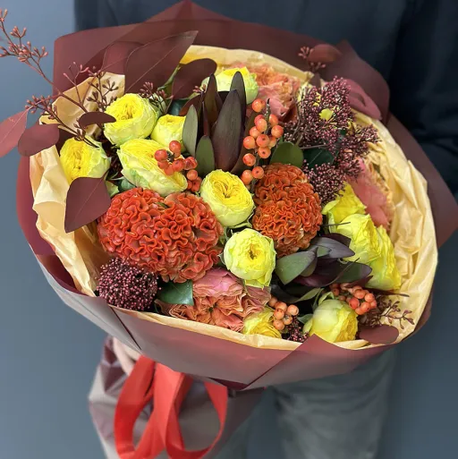 Осінній букет квітів у жовто-оранжевих тонах – це втілення тепла та затишку, які так потрібні в прохолодні дні. У складі букета: яскраві жовті троянди, насичені помаранчеві целозії, ягідки гіперикуму та декоративна зелень, що додає композиції гармонії.