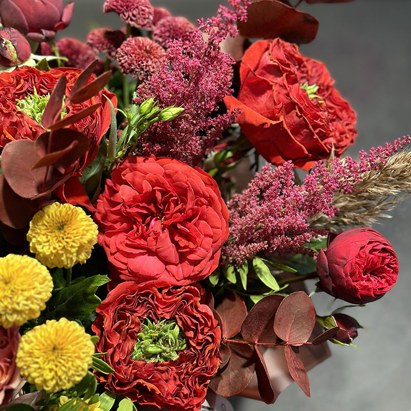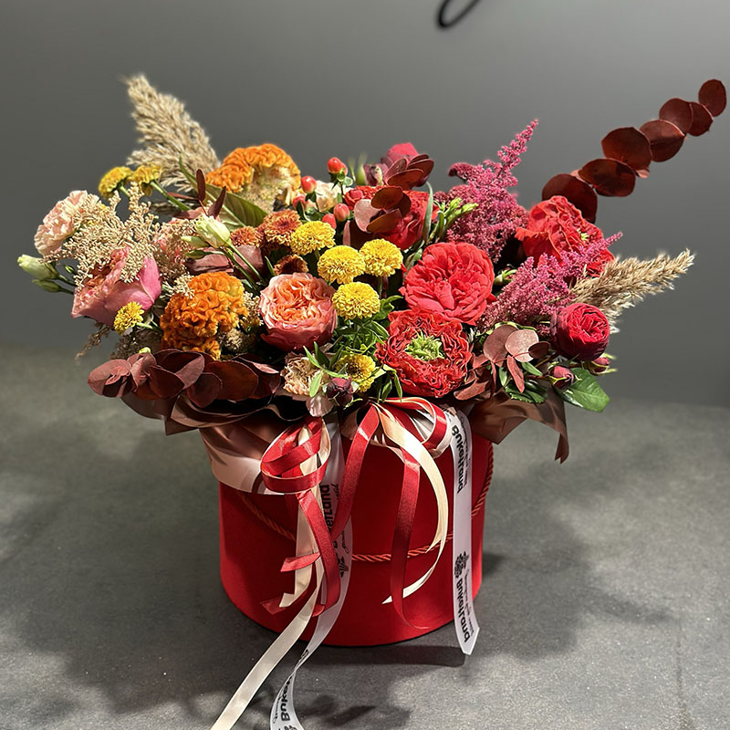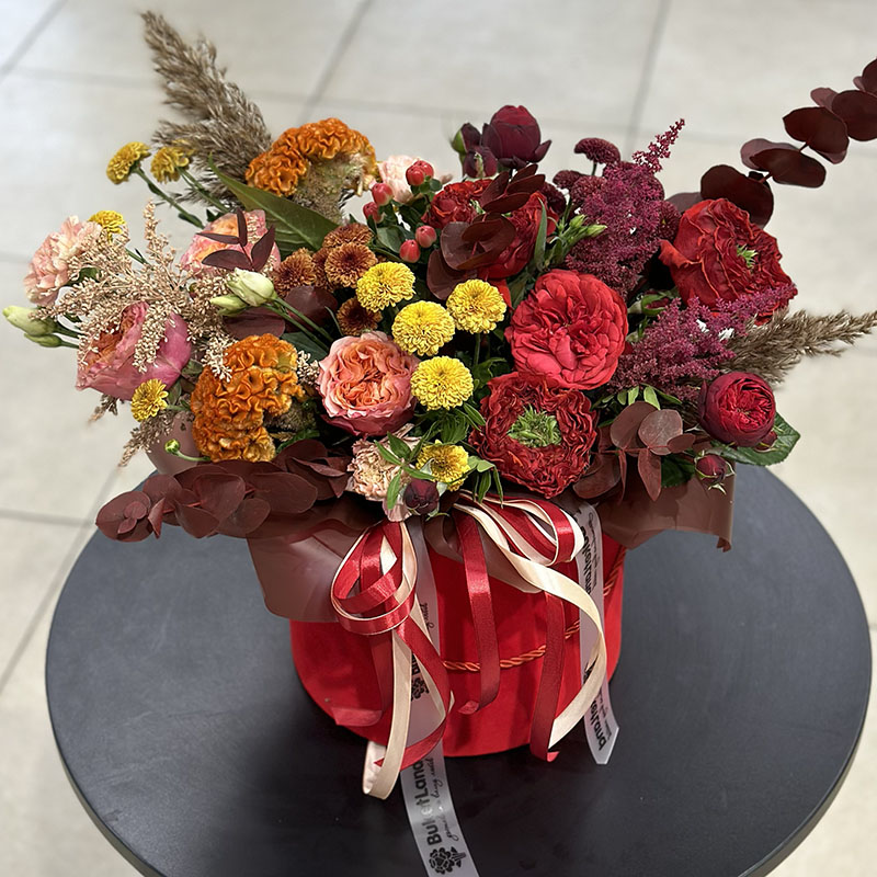 Осіння композиція в коробці — це справжній витвір мистецтва, що поєднує тепло осінніх барв та витончену елегантність. Композиція створена з яскравої астильби, текстурної гвоздики, кущових троянд сорту Velvet Blossoms, півонієподібних троянд, гіперікума, хризантеми та евкаліпта. Усе це оформлено у стильну коробку червоного кольору, яка додає композиції сучасності й практичності.