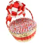 Подарунковий кошик «Сюрприз XXL» — презент з будь-якої нагоди, хоча оформлений кошик досить яскраво: шикарний червоно-білий бант, обтягнута стрічкою плетена ручка. Стрічка є і на самому кошику. Яскраві кольори апріорі говорять про свято чи торжество, а частування вистачить усім присутнім.