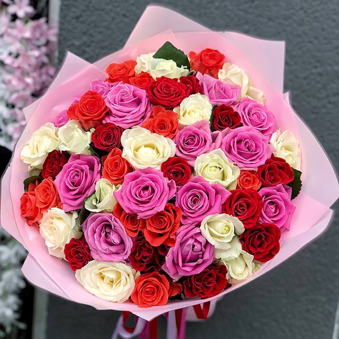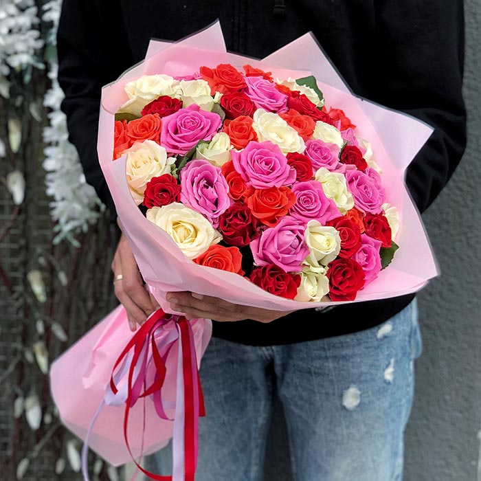 51 роза микс 50 см — это изысканная композиция, которая способна покорить сердце любого человека. Контрастные цвета красных, розовых и кремовых роз создают роскошный акцент, идеально подходящий для праздника или особого события.