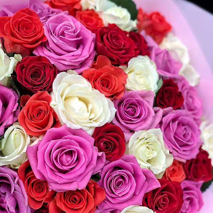 - 51 роза разных оттенков, собранные в идеальное цветочное полотно.