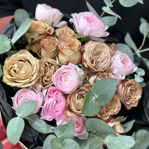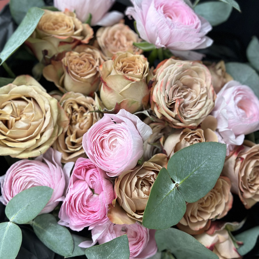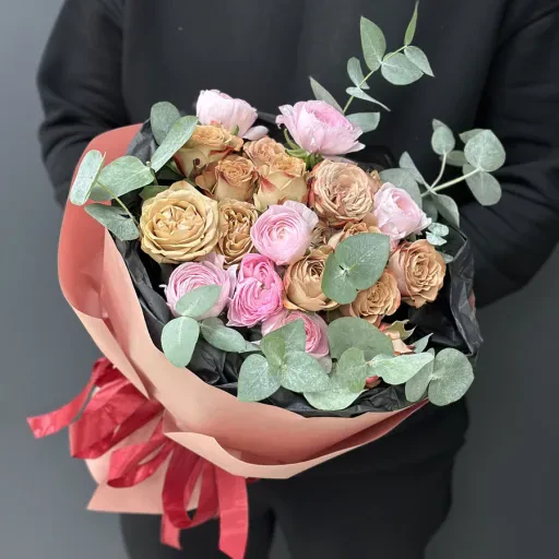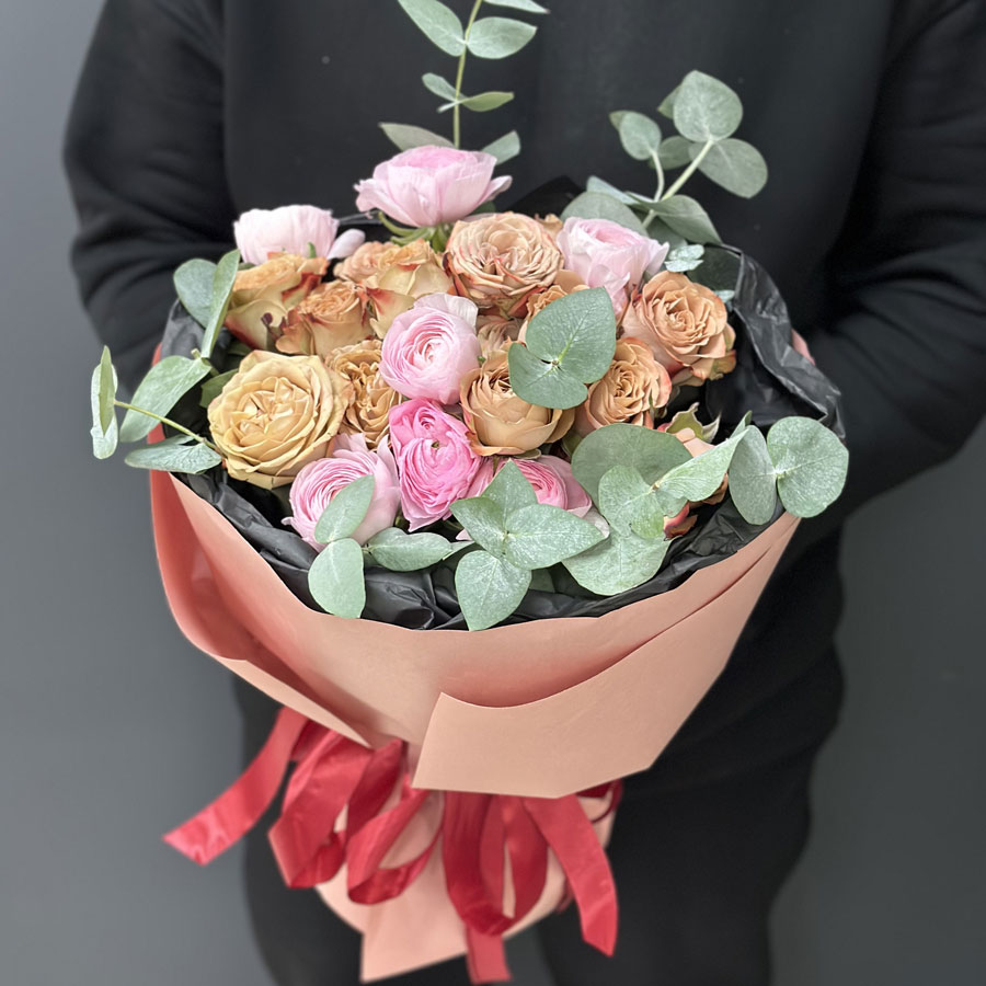 Авторский букет с ранункулюсом и кустовой розой