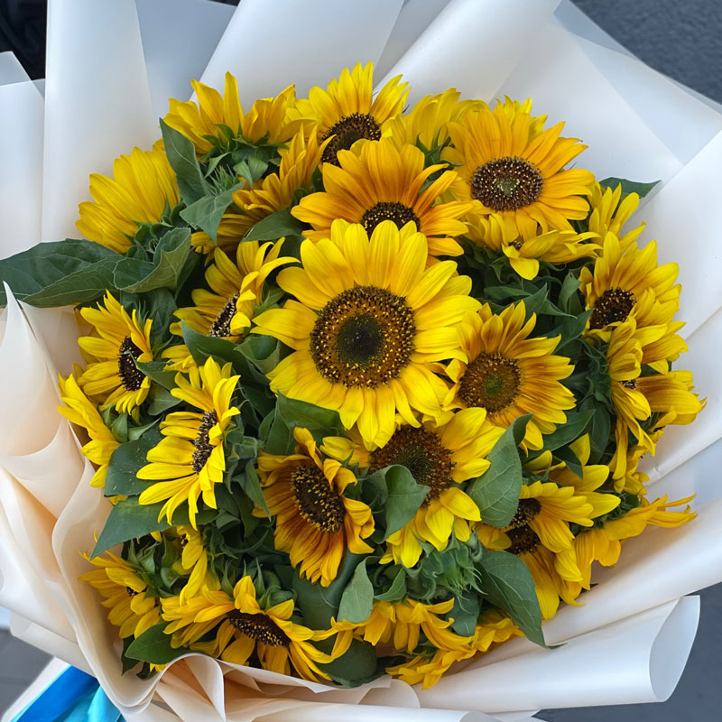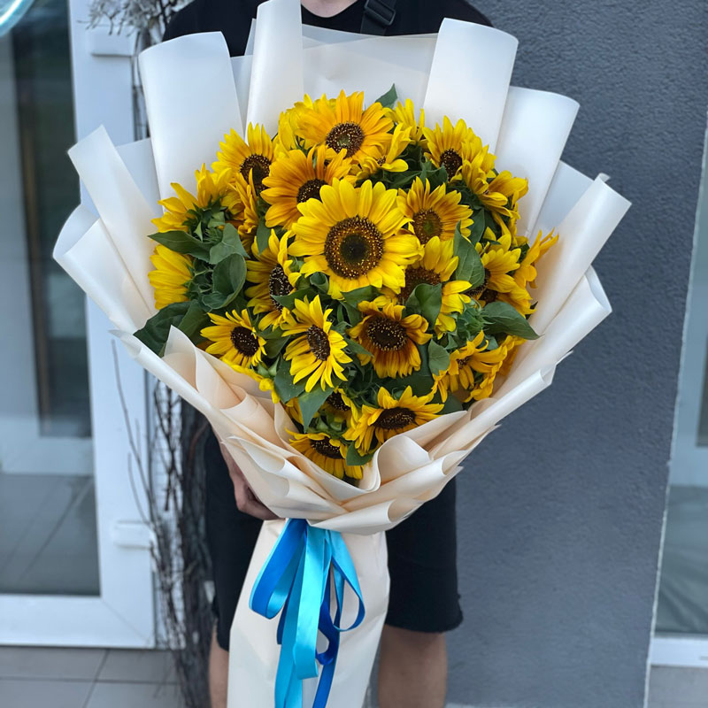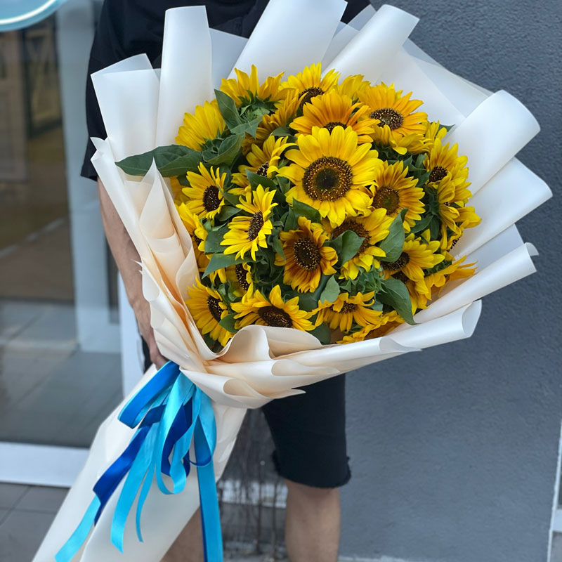 Подсолнухи легко поднимают настроение и символизируют процветание и оптимизм. Их красота гармонично дополнена современным оформлением, что придает букету утончённость. Уход за букетом прост: меняйте воду каждые 2-3 дня и держите его вдали от прямых солнечных лучей.