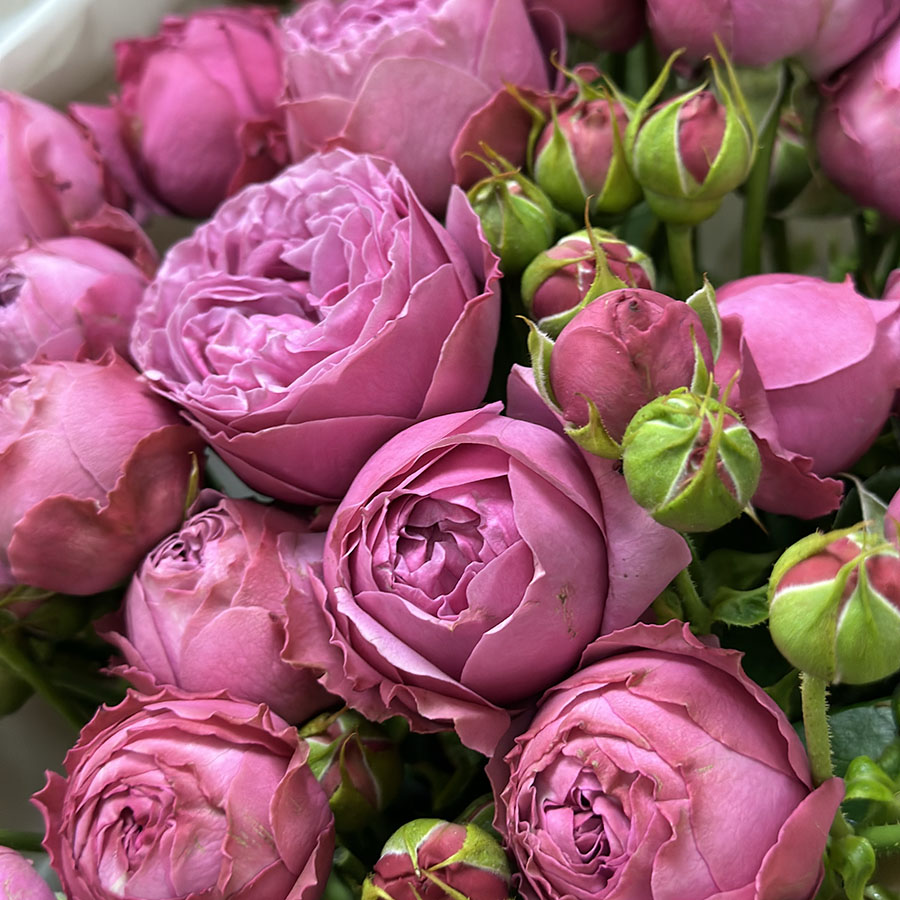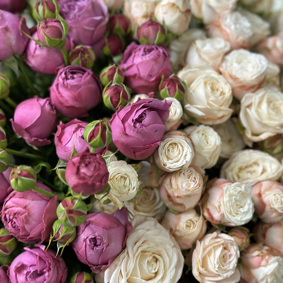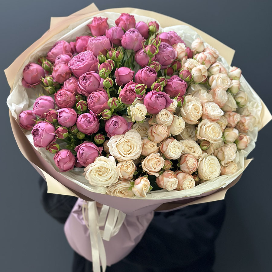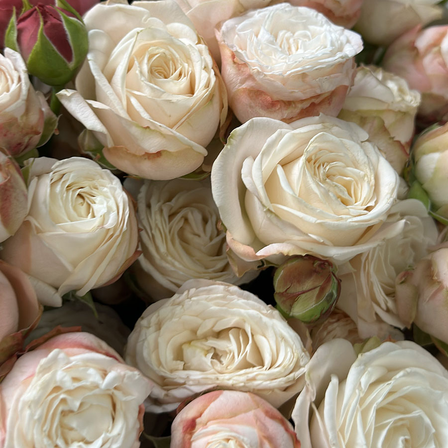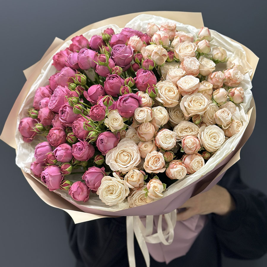 - Состав: Кремовые кустовые розы – 13 шт., розовые кустовые розы – 12 шт.
