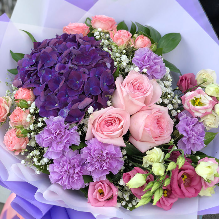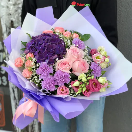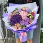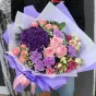 Сочетание нежно-розовых, сиреневых и фиолетовых оттенков с белыми акцентами придаёт букету загадочность, нежность и элегантность.
