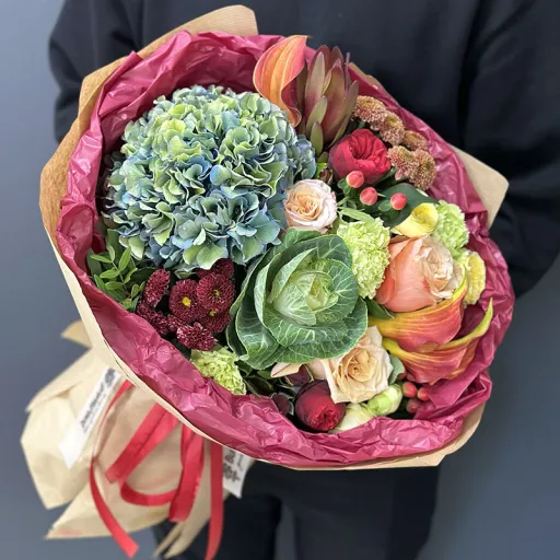 Уникальный и стильный осенний авторский букет | размер М станет идеальным выбором для тех, кто хочет удивить близкого человека. В букете гармонично сочетаются теплые осенние оттенки и богатая текстура цветов. Состав включает элегантную гортензию, нежные каллы, пионообразные розы, хризантемы и декоративную капусту. Каждое цветок тщательно отобрано нашими флористами, чтобы создать гармоничный ансамбль, передающий атмосферу осени.