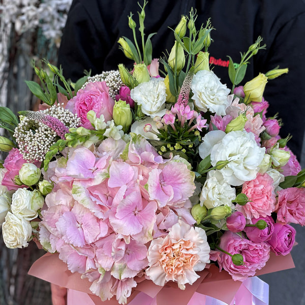 Больше похожих цветочных композиций в разделе букеты с гортензией.