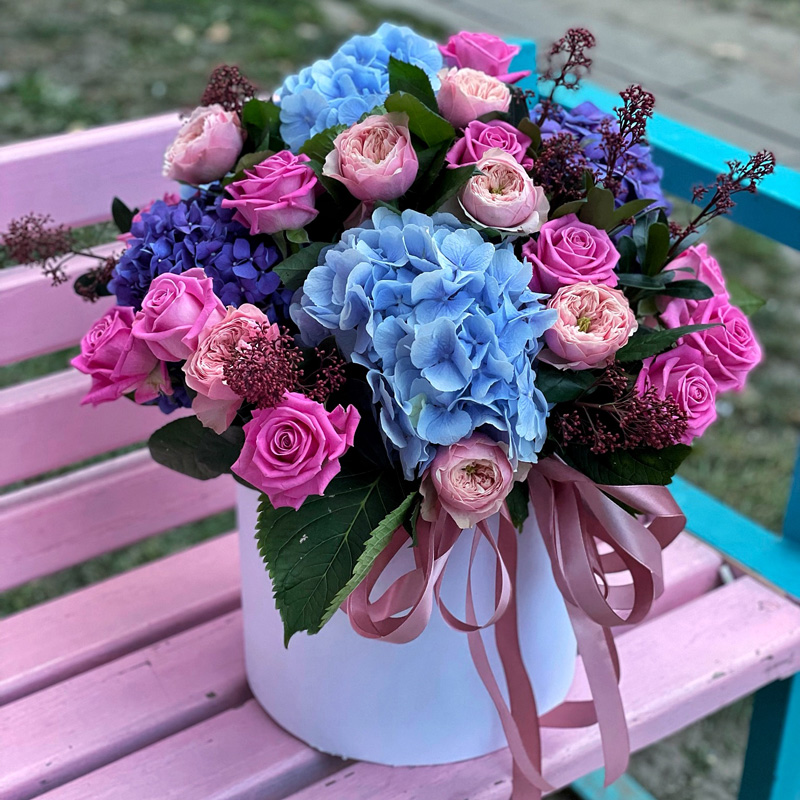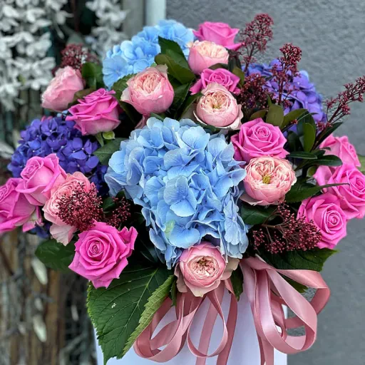 Нежность, утонченность и роскошь – именно так можно описать букет цветов «Тайна сердца». Это настоящий шедевр флористического искусства, который сочетает в себе аристократические гортензии, нежные эквадорские розы, изысканную розу Аква и загадочную скиммию. Гармония оттенков – от нежно-розового до глубокого синего – создает эффектный контраст, который привлекает внимание и очаровывает с первого взгляда.