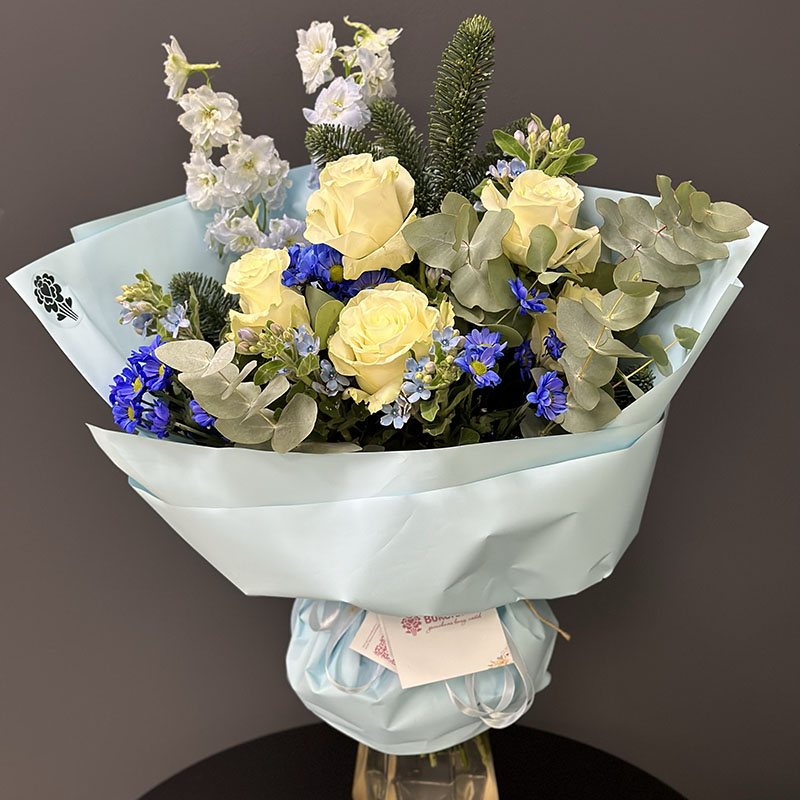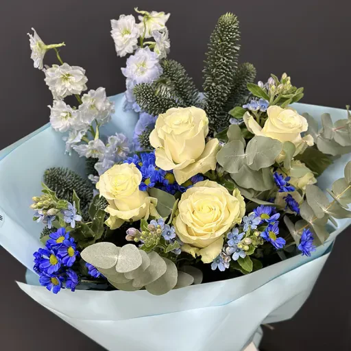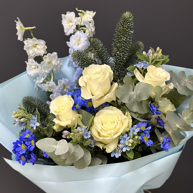 - Состав: 4 розы Mondial, 2 дельфиниума, 5 цветов оксипеталума, 3 хризантемы, 1 эвкалипт и 1 нобилис.