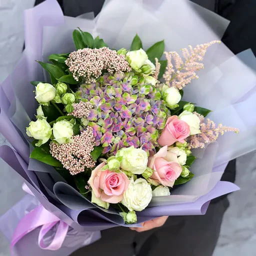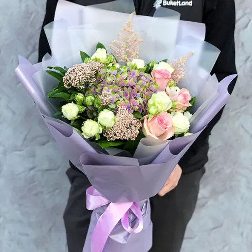 Екзотичний букет в світлих нюдових тонах - саме те, що потрібно для подарунка ніжній дівчині, витонченою жінці, молодій красуні або романтичною особі. Вишукане поєднання великих півоній і зовсім крихітних бутонів, яскравої зелені і ніжних лілово-бежевих відтінків. До цього букету не потрібні ніякі доповнення, він стане відмінним подарунком або сюрпризом. Доставка квітів в Києві допоможе втілити в життя найсміливіші флористичні фантазії, фахівець врахує побажання до кольорової гами і складе унікальну композицію. Оптимальний розмір цього букета робить його універсальним подарунком на будь-який випадок.