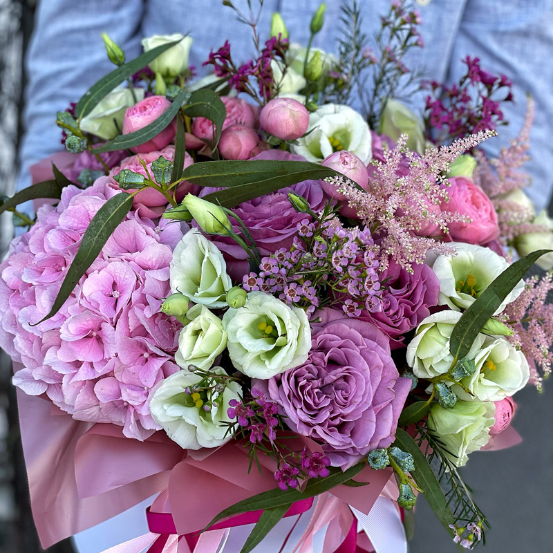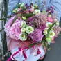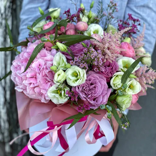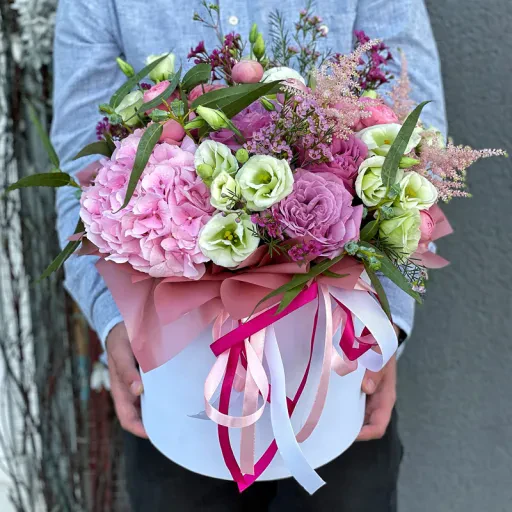 Вишуканість та ніжність в одному букеті! Квіти в капелюшній коробці «Florance» – це справжній витвір мистецтва, що поєднує ніжність пудрової гортензії, граційність евкаліпта та розкішну текстуру кущової півоноподібної троянди. Композицію доповнює повітряна астільба, яка надає букету легкості, а хамелаціум і еустома додають йому вишуканості та свіжості.