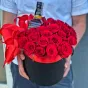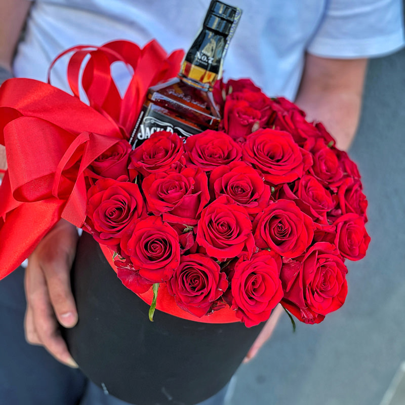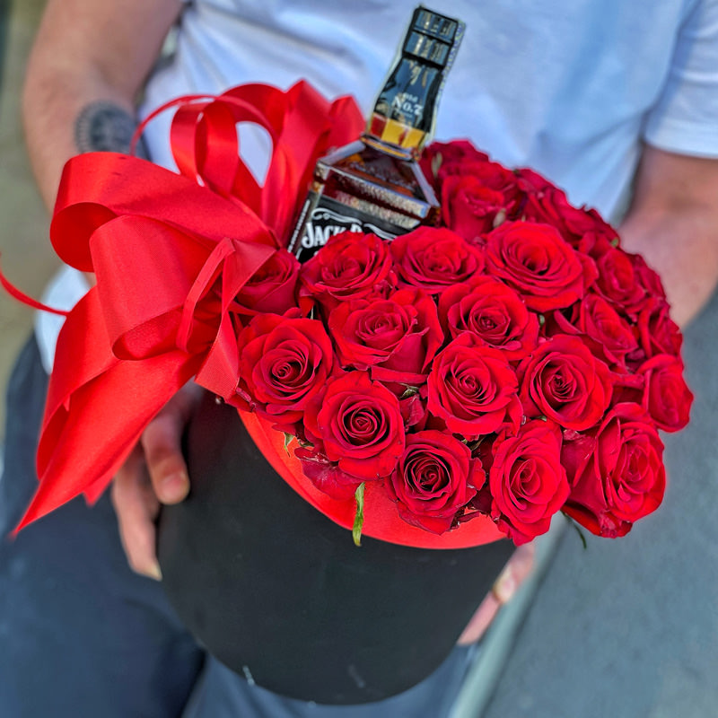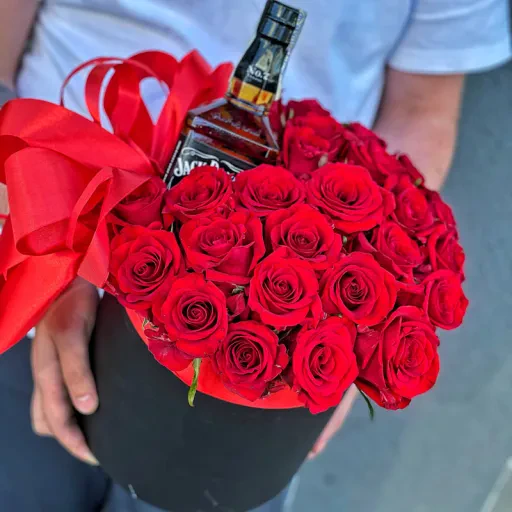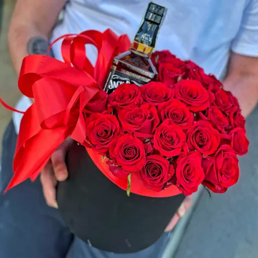 Вишукані квіти в капелюшній коробці «Прекрасний вечір» — це поєднання глибокого червоного кольору троянд, ідеально розташованих у стильній капелюшній коробці, доповнене елегантною стрічкою. А родзинка композиції – пляшка благородного алкоголю, яка надає подарунку ще більшої цінності.