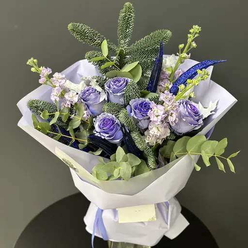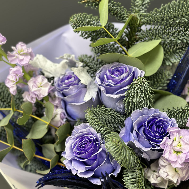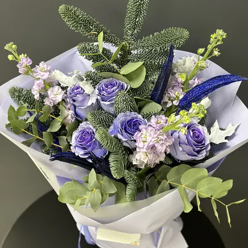 Цей букет стане чудовим вибором для вираження найтепліших почуттів. Його фіолетово-сріблясті відтінки ідеально підходять для створення затишної атмосфери. Зимовий букет «Magic Time» також доповнений стильним пакуванням, яке додає завершеності.
