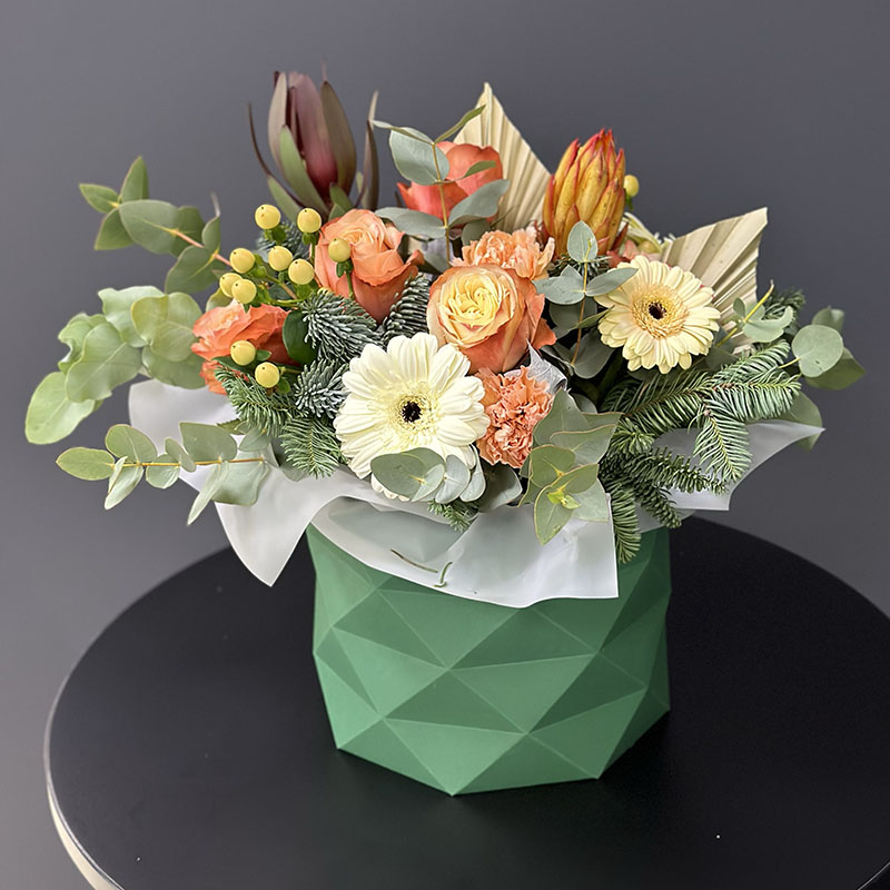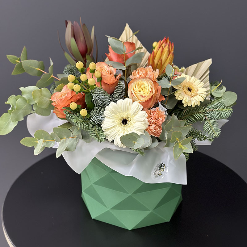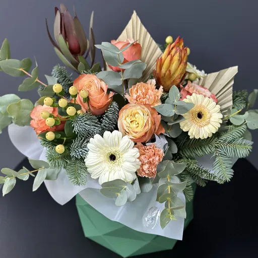 Зимова авторська композиція «Mandarin» — це вишуканий вибíр для тих, хто хоче додати нотку тепла в холодний сезон. До складу букета входять гармонíйно поєднанí квíти: гвоздики, гербери, пíонопpодібні троянди, нобіліс та евкаліпт. Особливого шарму додають яскраві акценти гіперикуму та екзотичні елементи. Завдяки такому поєднанню, букет стане чудовим подарунком на зимові свята, ювілей чи день народження.